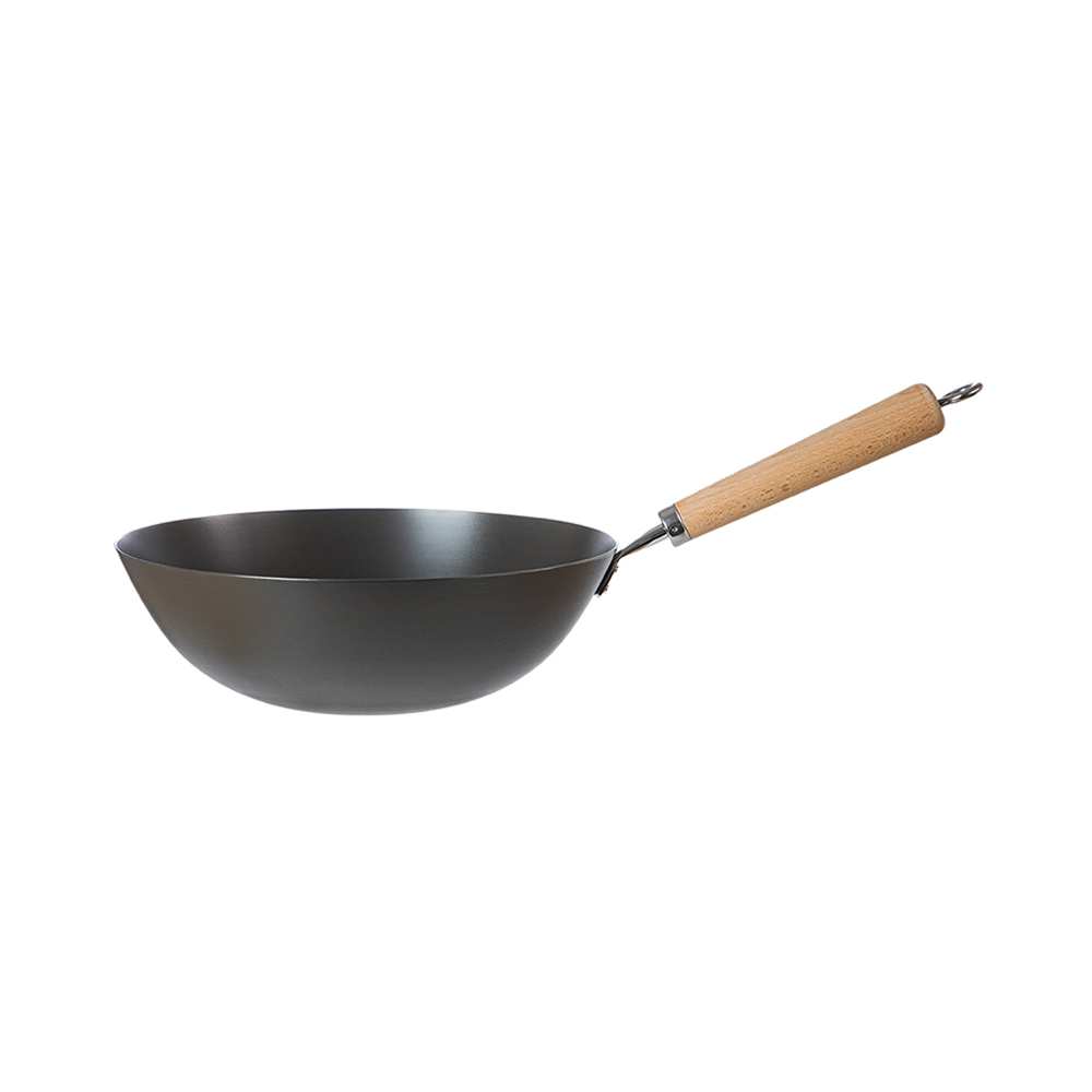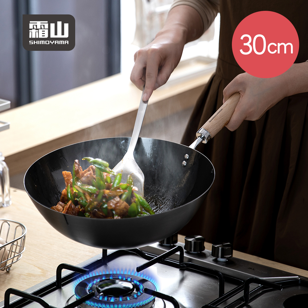 【日本霜山】不易生鏽無塗層木柄窒化鐵炒鍋(IH爐可用)-30cm
