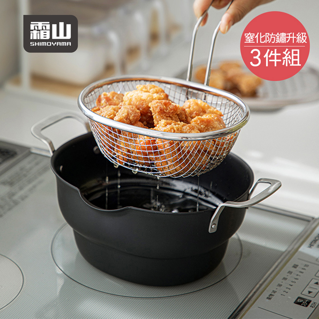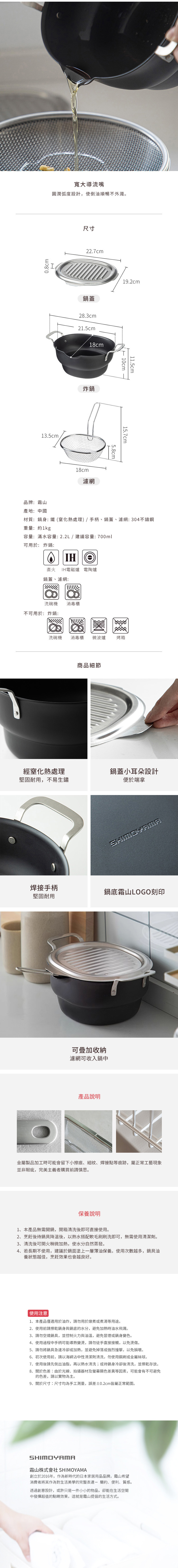 尺寸:[炸鍋]長28.3×寬18×高11.5cm、[鍋蓋]長22.7×寬19.2×高0.8cm、[濾網]長18×寬13.5×高15.7cm