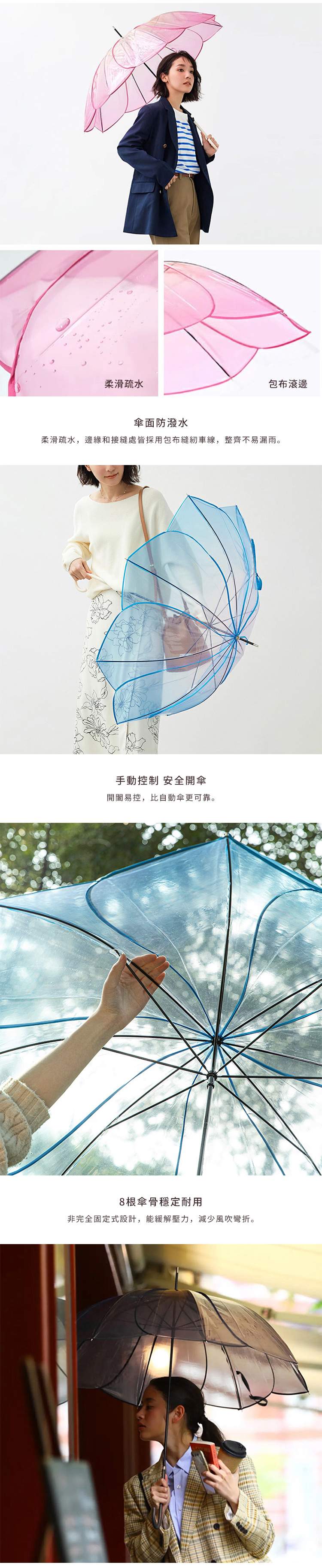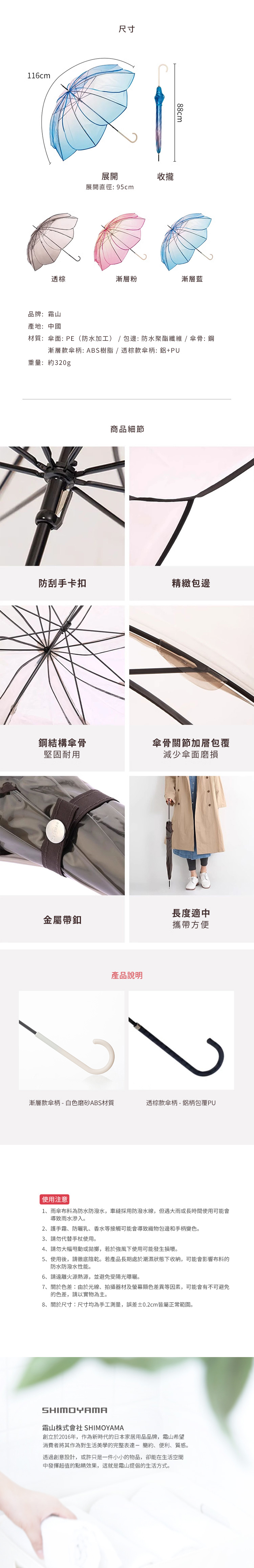 材質:[傘面]PE(防水加工)、[包邊]防水聚酯纖維、[傘骨]鋼、[傘柄]漸層款-ABS樹脂 / 透明棕-鋁+PU