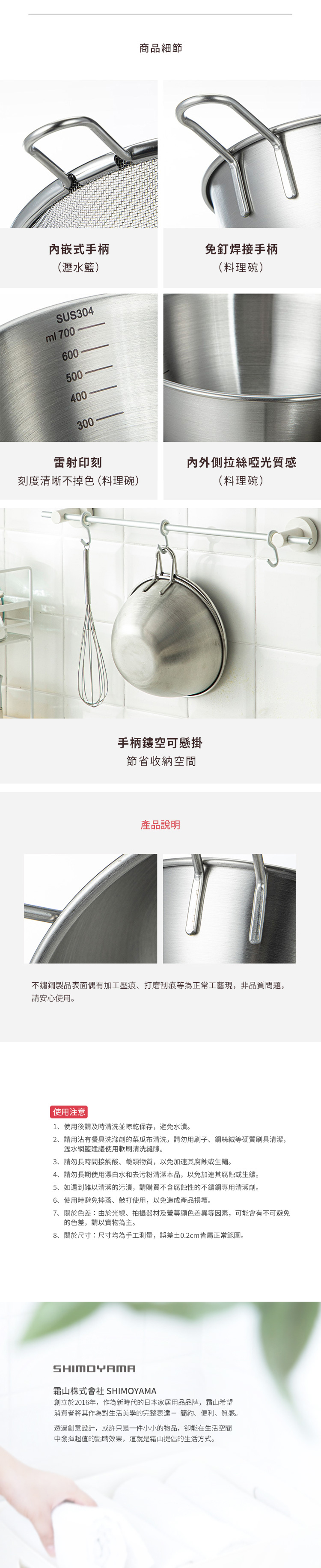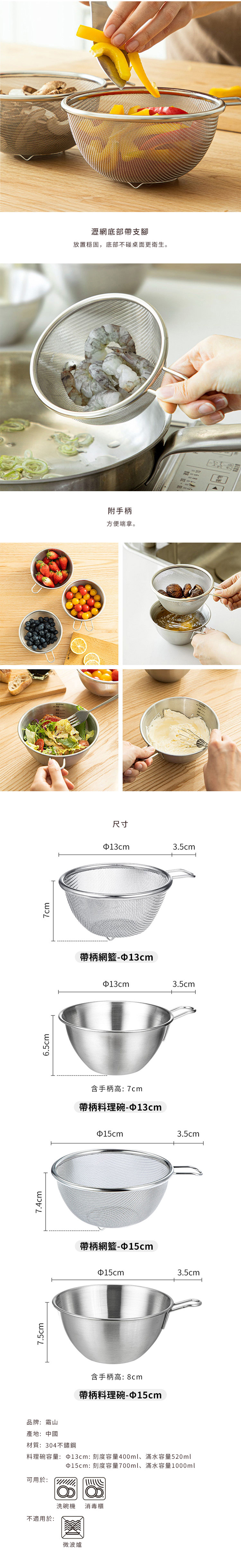 尺寸:[網籃]長(含手柄)16.5×直徑13×高(含底腳)7cm、[料理碗]長(含手柄)16.5×直徑13×高(含手柄)6.5cm