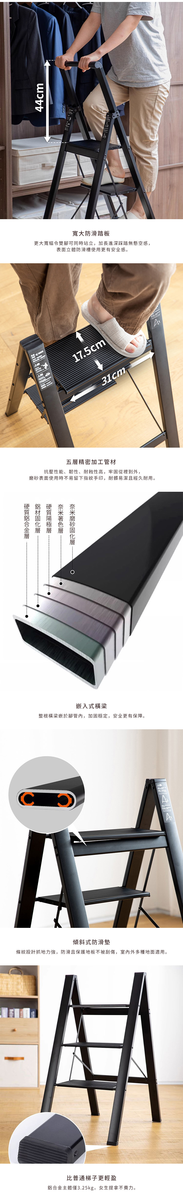 材質:[梯子]鋁合金、[支架]鐵、[連結零件]尼龍、[止滑墊]TPE熱塑性彈性體
