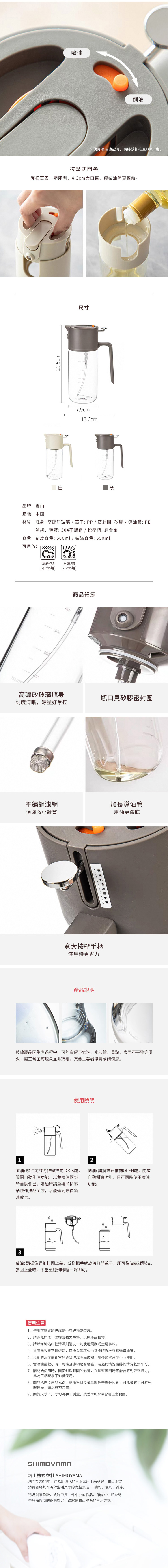材質:[瓶身]高硼矽玻璃、[蓋子]PP、[密封圈]矽膠、[導油管]PE、[濾網、彈簧]304不鏽鋼、[按壓柄]鋅合金