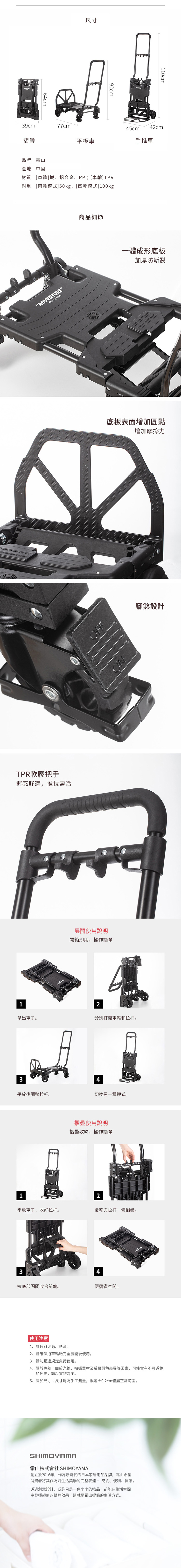 尺寸:[手推車]長45×寬42×高110cm、[平板車]長77×高92cm、[摺疊]長39×寬12×高64cm